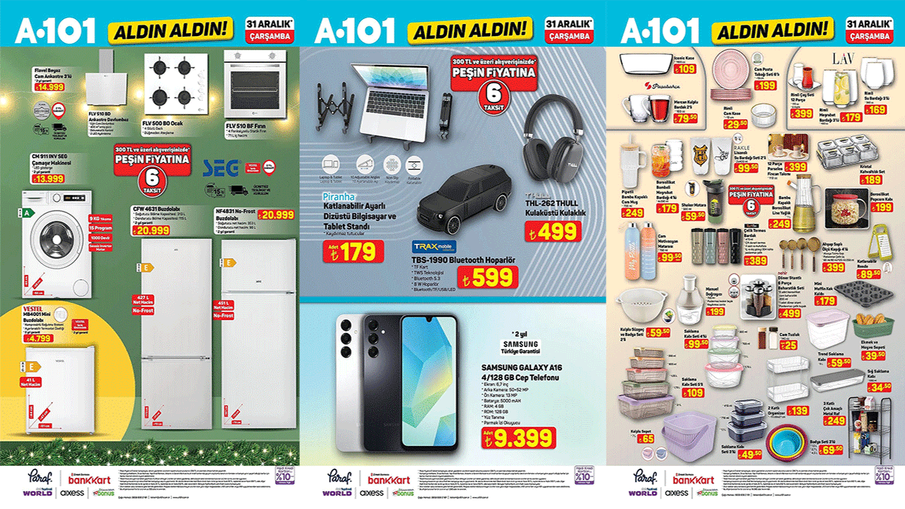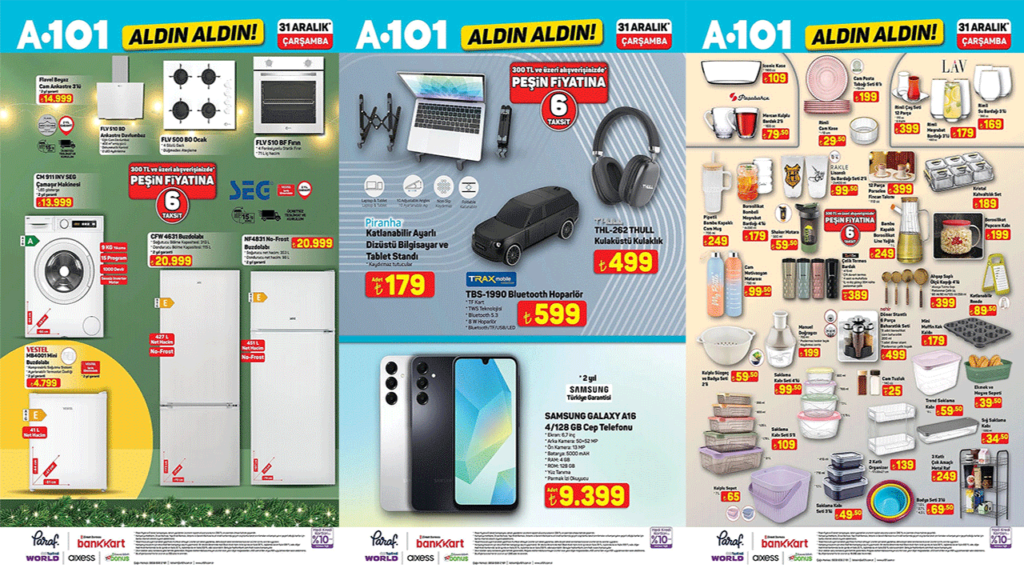 A101 market aralık ayı indirimlerine devam ediyor. 31 Aralık 2025 Çarşamba gününden itibaren indirimli onlarca indirimli ürünler A101’de. A101 aldın aldın indirimlerinde hangi ürünler var? İşte, A101 31 Aralık 2025 Çarşamba aktüel ürünler kataloğu…