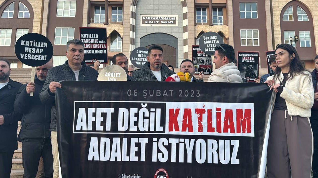 Adalet Peşinde Aileleri Platformu, gelecek hafta TBMM Genel Kurulu’na gelmesi beklenen 11. Yargı Paketi’ne ilişkin, Kahramanmaraş Adliyesi önünde basın açıklaması yaptı. Aileler açıklamada, „Afet değil katliam, adalet istiyoruz“, „Adalet için buradayız“, „Katiller hesap verecek“, „Yüreğimizde acı, dilimizde adalet“, „Deprem değil, adaletsizlik yıkıyor“ ve „Öfkemiz, adaletin ateşi olacak“ yazılı pankart taşıdı.