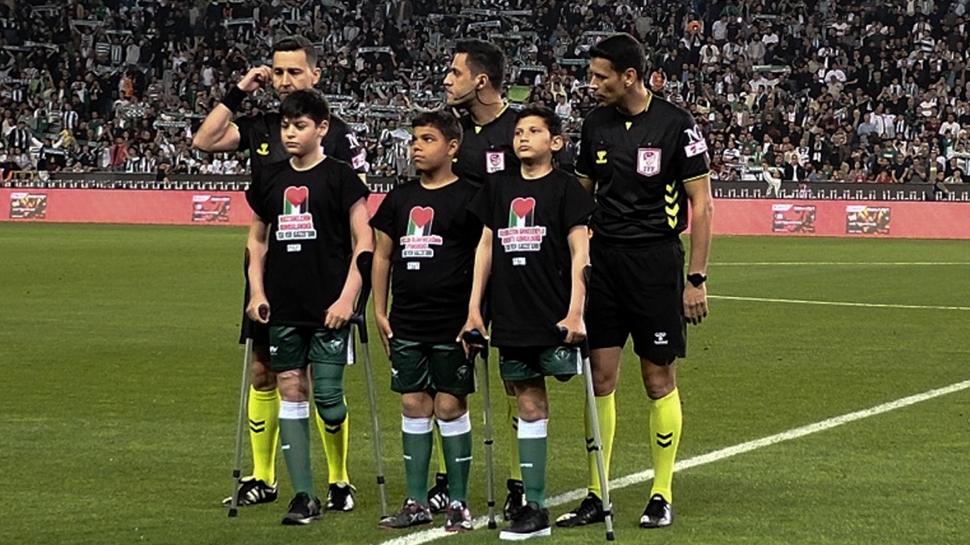 srail’in Gazze’ye yönelik yaptığı saldırılara dikkat çekildi. Sakat kalan çocuklar seremoniye katıldı, Futbolcular, “Gazze’de ekmek yok, hayat yok!” pankartıyla sahaya çıktı.